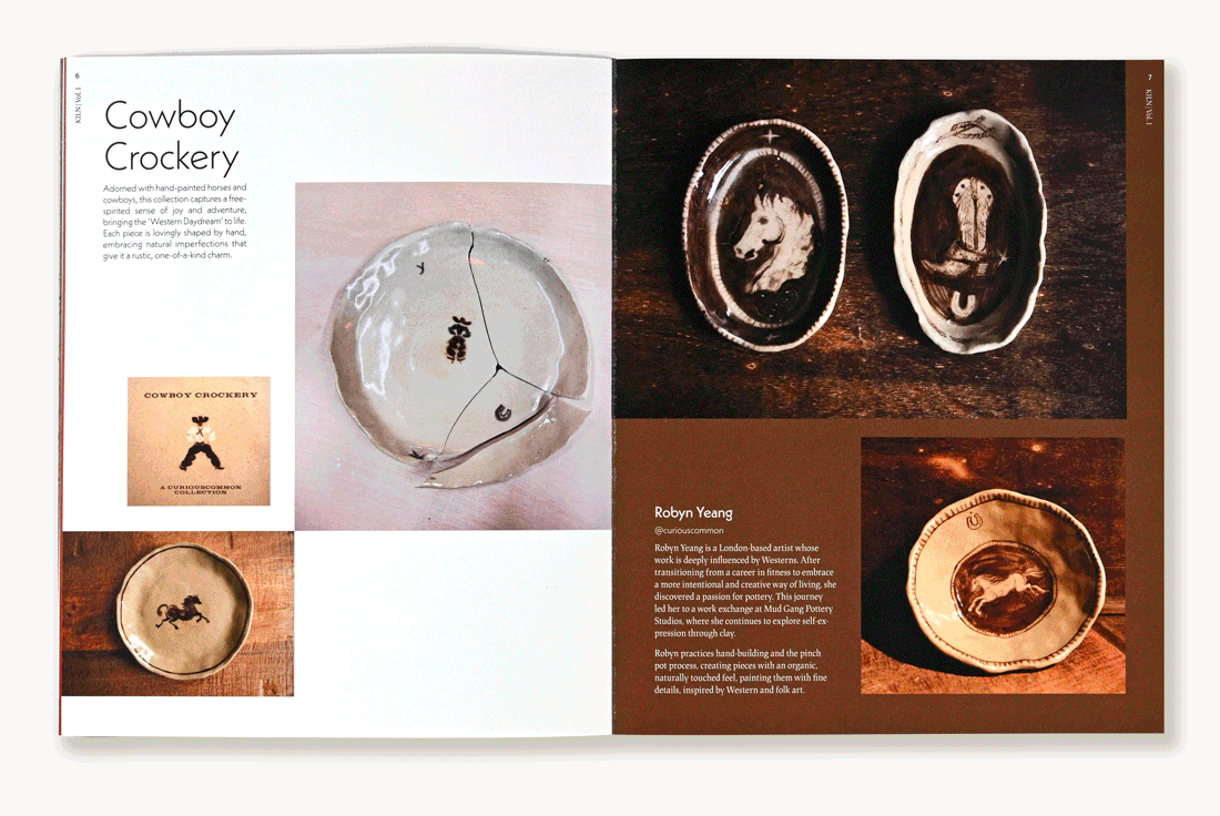 Kiln is an up-market magazine aiming to celebrate ceramic in all its forms. The content is a blend of artist profiles, individual pieces and the stories behind them – as shared by both artists and hobby makers. These act as a source of inspiration and education. Other content includes visual collections of ceramics sourced from online archives and an interview with a studio to provide further inspiration and create a well-rounded story of modern ceramics.